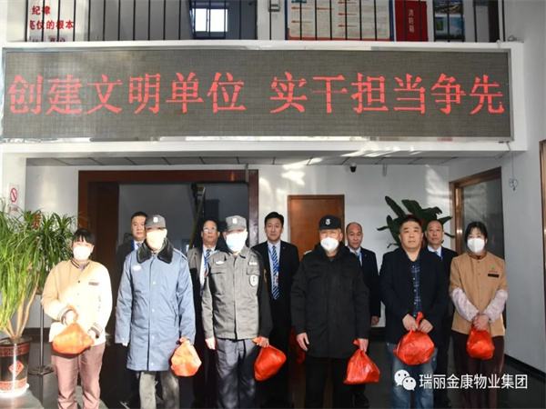 在新春佳節(jié)即將到來之際,為讓員工度過一個祥和圓滿的除夕夜。1月19日上午,瑞麗金康物業(yè)集團(tuán)董事長鄭民、總經(jīng)理宋兆巖、山東集結(jié)號總經(jīng)理鄒吉偉、泰城物業(yè)公司總經(jīng)理邱風(fēng)海、集團(tuán)審計(jì)中心主任盛善利一行特向部分服務(wù)項(xiàng)目堅(jiān)守一線的員工送去“暖心年夜飯”并向他們致以節(jié)日的問候,叮囑他們在工作中做好個人防護(hù)工作,注意防寒保暖。